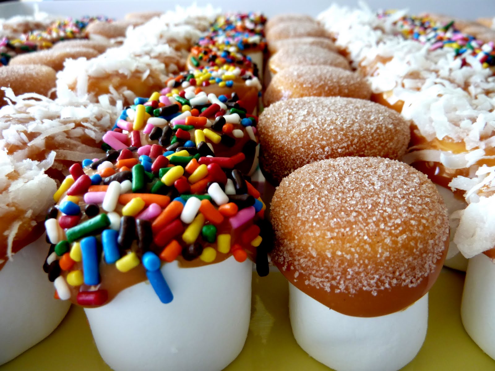 Its a really simple process. You simply heat up Carmel candies in the microwave (follow the package directions) and then dip a marshmallow in about half way. Let as much of the excess drip off as you can. Then dip it into your favorite topping. I used coconut, sprinkles, and cinnamon sugar. Then place them, marshmallow side down, on a piece of wax paper to set up.